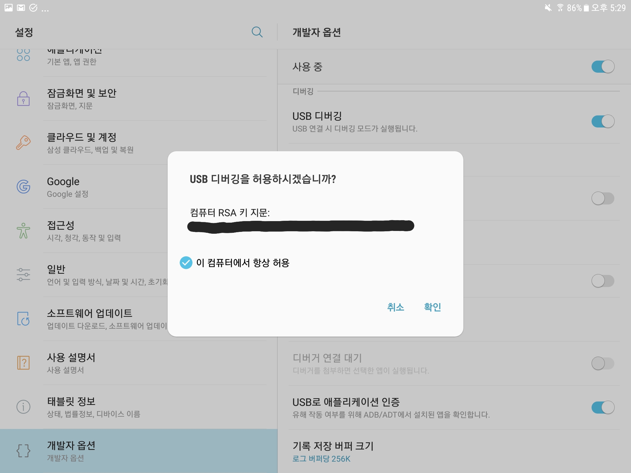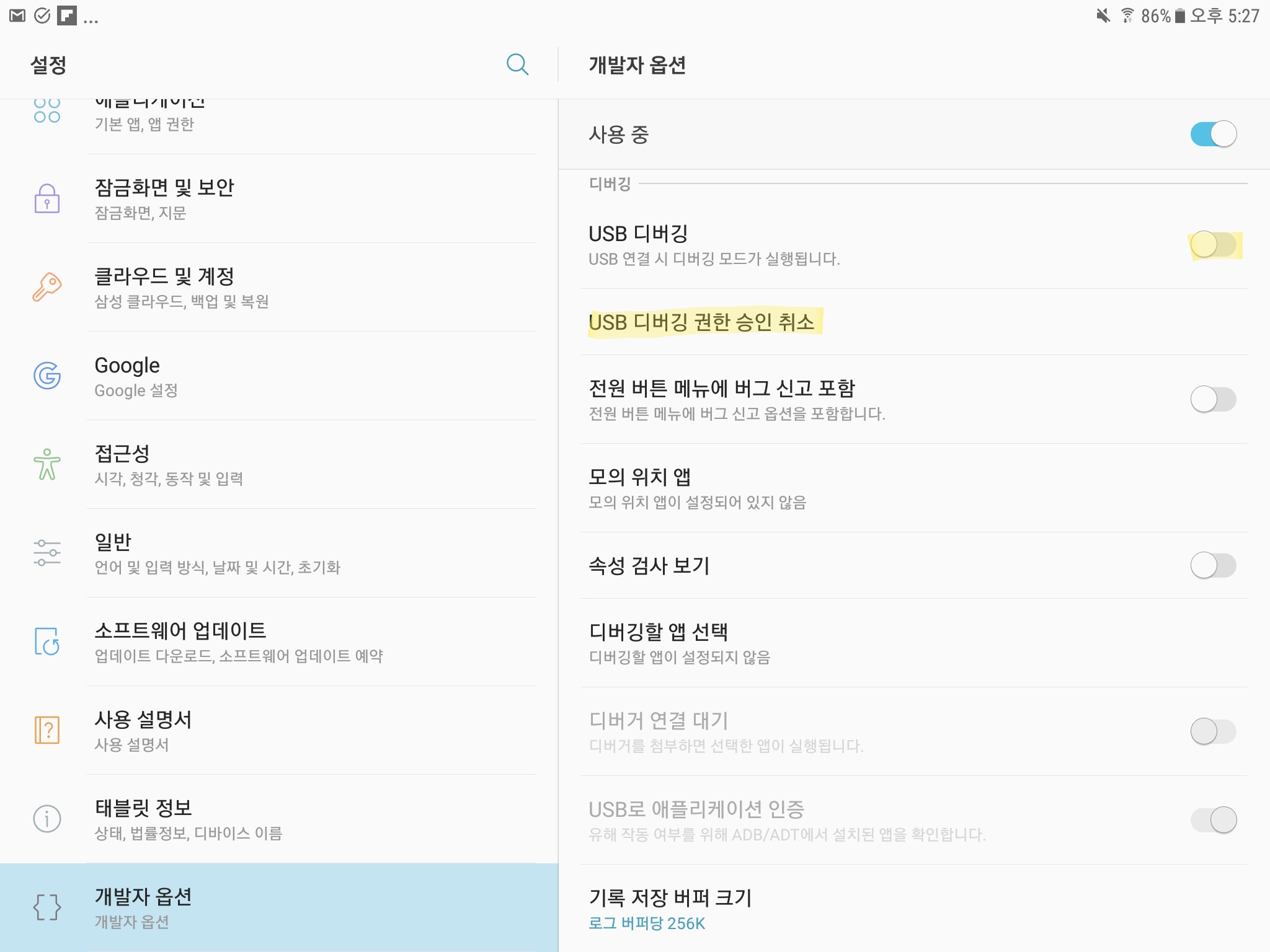 1. 연결하려는 디바이스에서 설정 -> 개발자 옵션 -> USB 디버깅 권한 승인 취소 후 USB 디버깅을 해제한다.