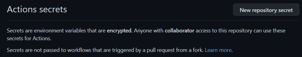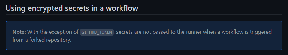 아래 문장을 읽어 보면 포크한 레포에서 보낸 PR로 트리거된 워크플로우에는 Secrets가 전달되지 않는다고 한다..!