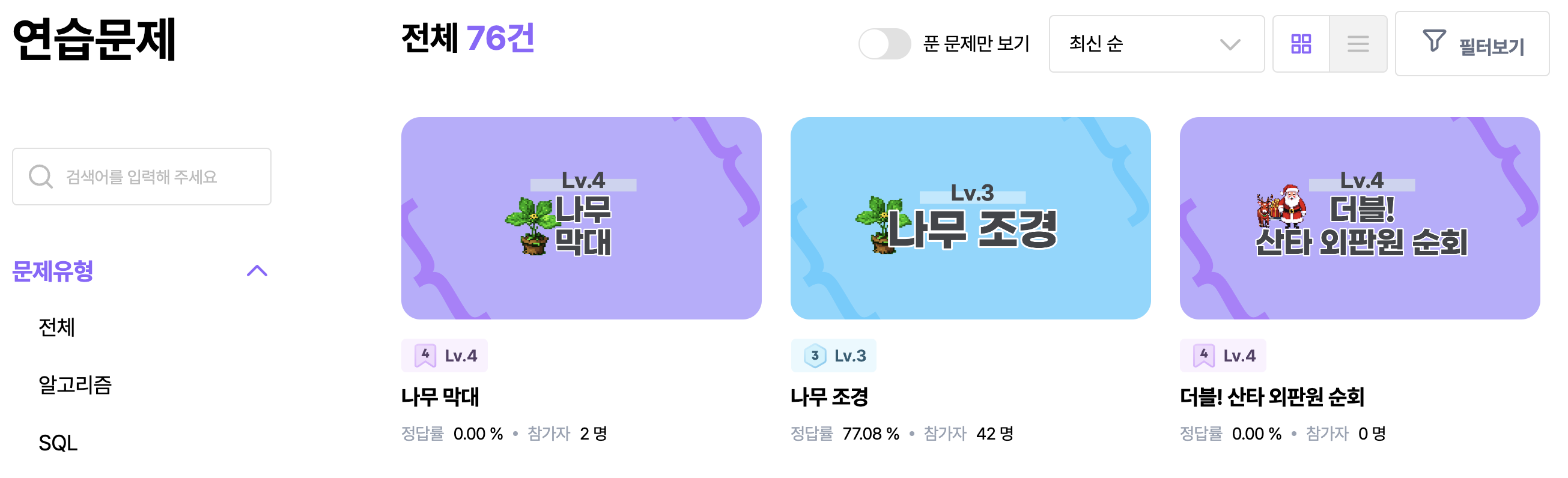유형별로 공부하기에는 분류가 잘 되어 있고 문제 수도 많은 백준이나 프로그래머스가 좋지만 소프티어에는 아직 문제 수가 많지 않기 때문에(76문제) 도장깨기를 목표로 할 수 있는 정도다