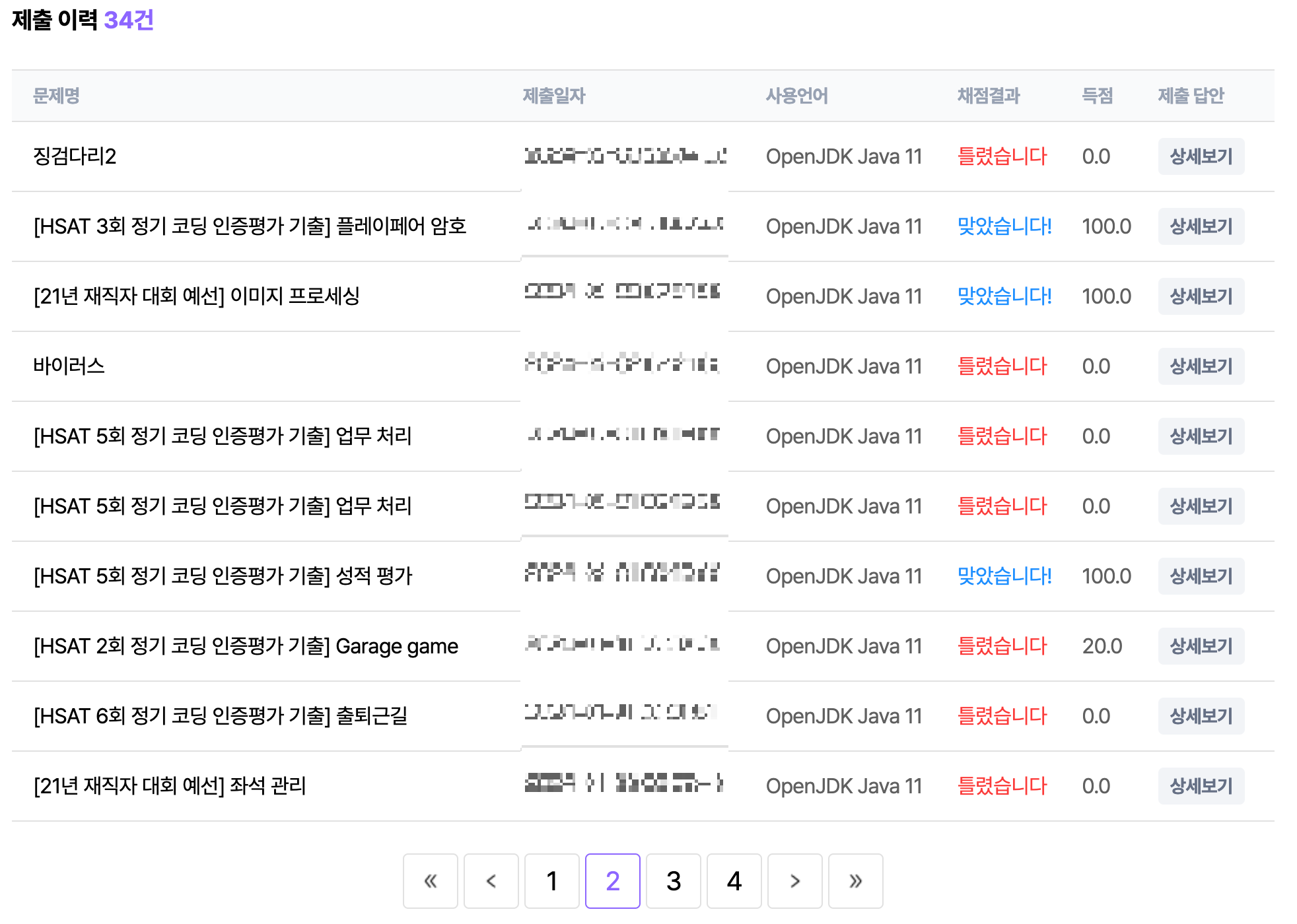 Lv.3 한 문제를 푸는 데는 대략 30분에서 길어도 50분 안에 어렵지 않게 풀어냈는데 정작 제출 이력으로 가서 채점결과를 보니 처참했다