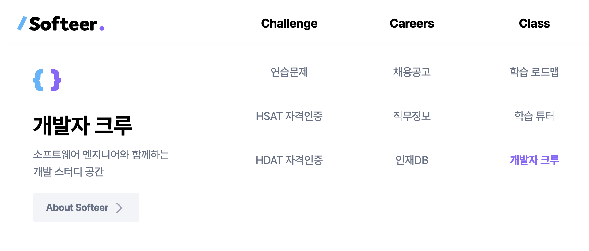 소프티어 홈페이지(https://softeer.ai/)에 방문하니 [개발자 크루]라는 탭이 새롭게 생겼다